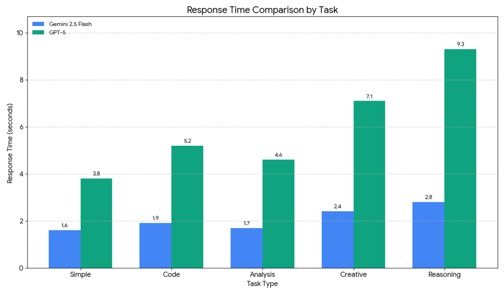| Task Type | Gemini 2.5 Flash | GPT-5 | Speed Advantage |