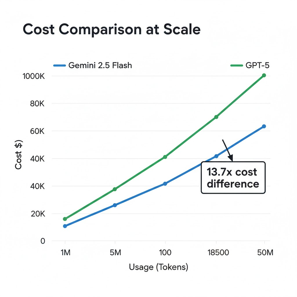 A: Gemini 2.5 Flash costs $0.075 per million input tokens versus GPT-5’s $1.25, making Flash 16.7x cheaper for input and 33x cheaper for output tokens. A typical application processing 10 million tokens monthly costs approximately $1,350 with Flash compared to $18,500 with GPT-5.