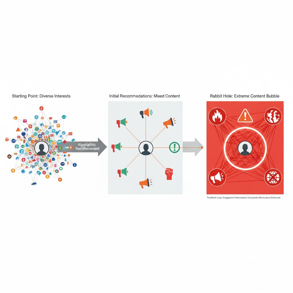 YouTube selects from hundreds of candidate videos for each slot on your homepage using what the company calls "candidate generation." It scores them on predicted watch time first. A conspiracy theory video might be predicted to hold attention longer than mainstream news because it's more emotionally activating. So YouTube shows it. Then engagement data flows back (did you watch it? did you skip it? did you watch the next recommended video?). The algorithm learns that conspiracy content performs well for certain users. Within weeks, the algorithm has built a radicalization funnel without any human or explicit decision to do so. Researchers studying YouTube's recommendation algorithm have documented this process repeatedly, showing how innocent interests can gradually shift toward extreme content.