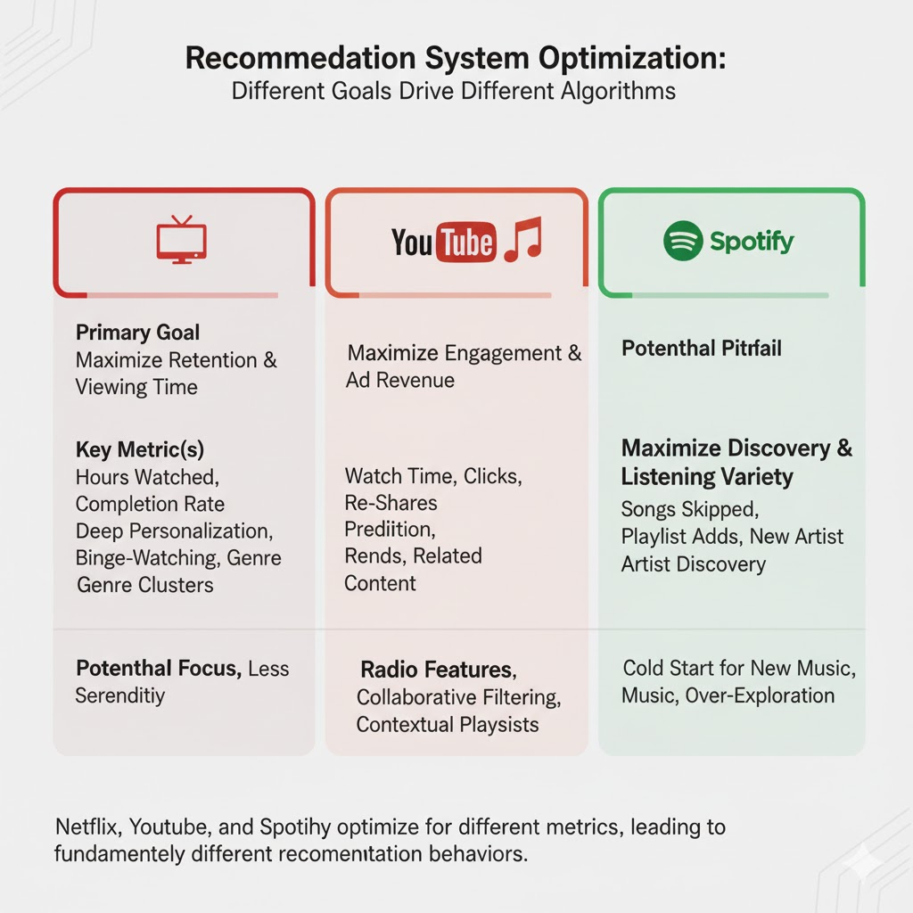 Netflix, YouTube, and Spotify optimize for different metrics, leading to fundamentally different recommendation behaviours.