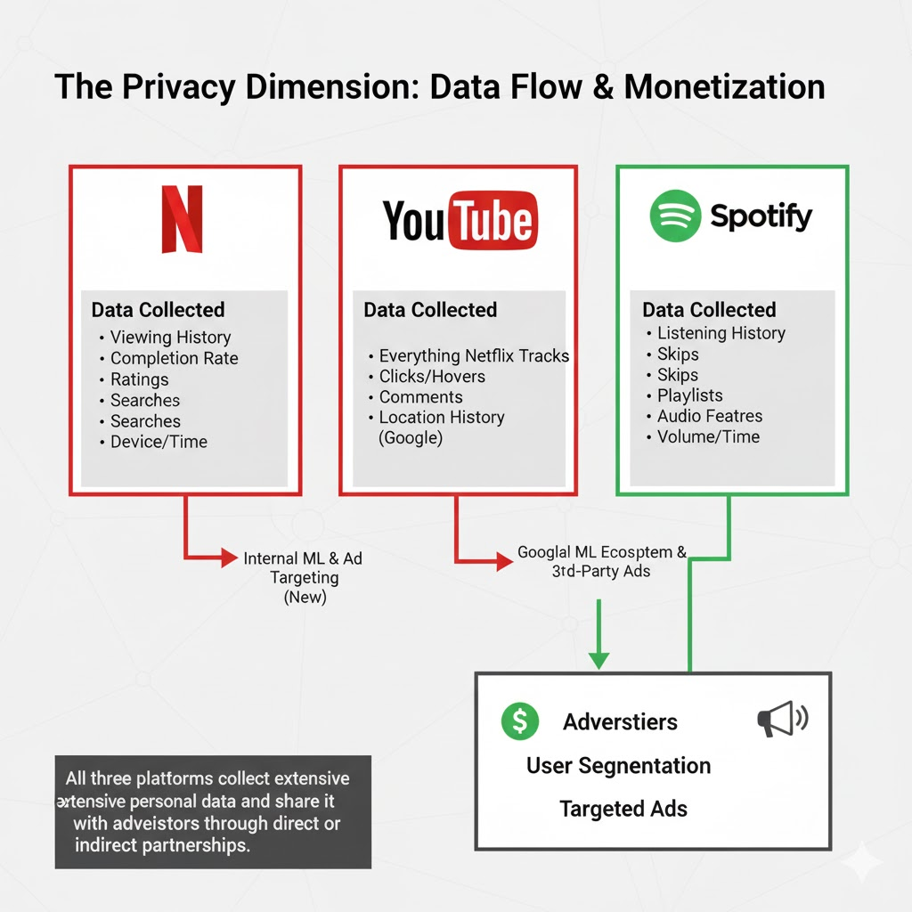 Building accurate recommendations requires invasive data collection. Netflix knows when you paused Mad Max at 1:47 PM on a Thursday. YouTube knows you searched for "anxiety treatment" and what videos you watched next. Spotify knows you listened to sad songs exclusively between 2 AM and 4 AM for two weeks. This data is gold for marketers and terrifying for privacy advocates.