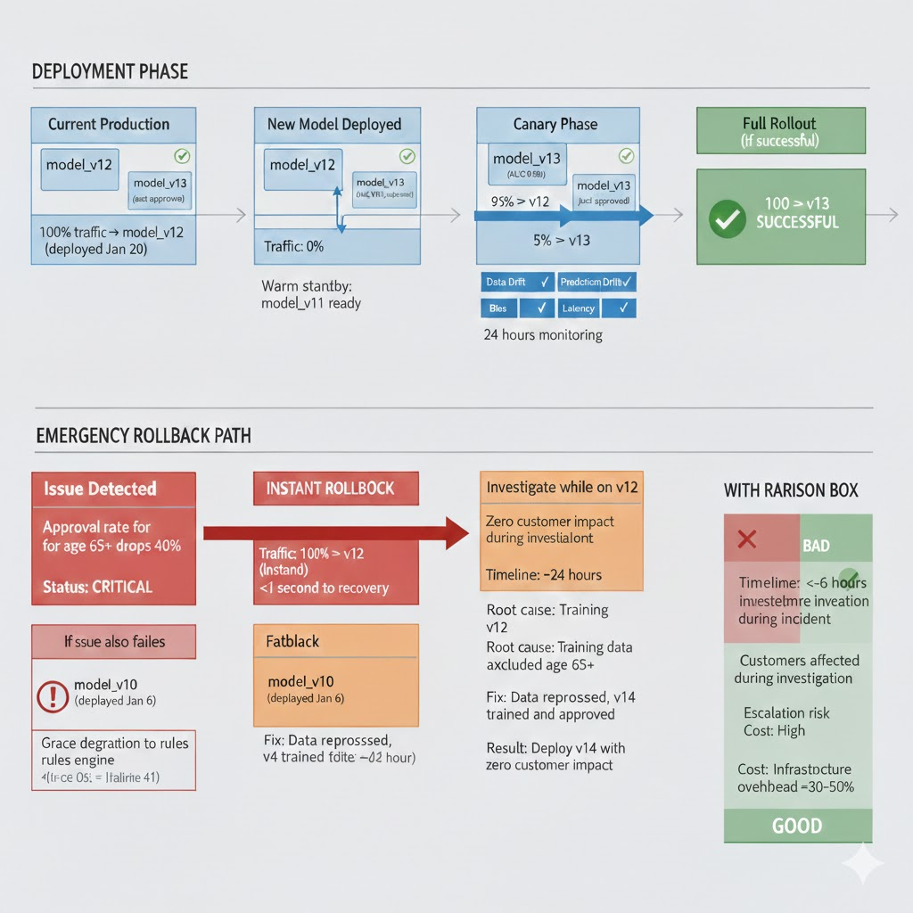 - Rollback is faster than retraining. Multi-model serving is standard infrastructure.