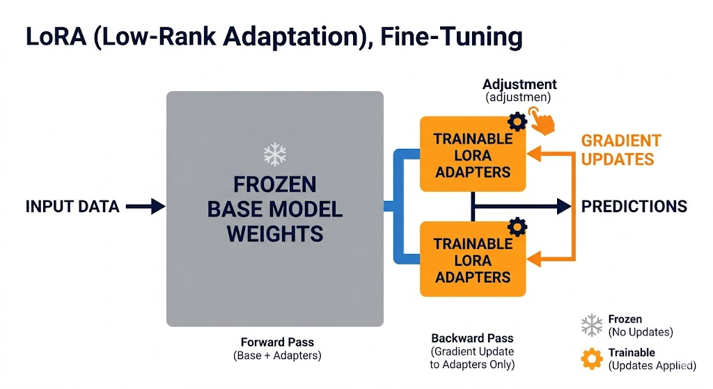 LoRA / QLoRA (Parameter-Efficient Fine-Tuning). Freezes the base model and trains small adapter layers on top. QLoRA adds 4-bit quantization, enabling fine-tuning of 7B models on a single consumer GPU. This is the standard approach for most data teams in 2026 it cuts compute requirements significantly while delivering comparable results for task-specific adaptation.