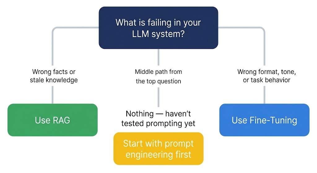 Where teams consistently get this wrong is by skipping the diagnostic step and defaulting to whichever approach feels more sophisticated. Fine-tuning on a knowledge problem is an expensive way to produce a model that formats incorrect answers consistently. RAG on a behavior problem is a retrieval pipeline that retrieves the right documents and still outputs the wrong format. Do the diagnosis first. Build second.