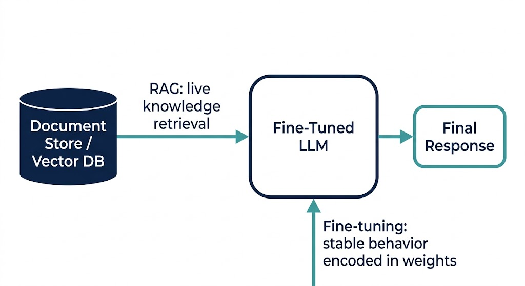 Can I use RAG and fine-tuning at the same time? Yes, and most mature production systems do. The standard pattern is a fine-tuned model for behavioral consistency and output format, with a RAG layer providing current factual knowledge. They address different failure modes and are architecturally compatible.